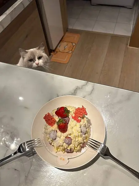 但對我來說,這只是個簡單的甜點,對雪寶來說,卻是一場視覺上的「酷刑」。